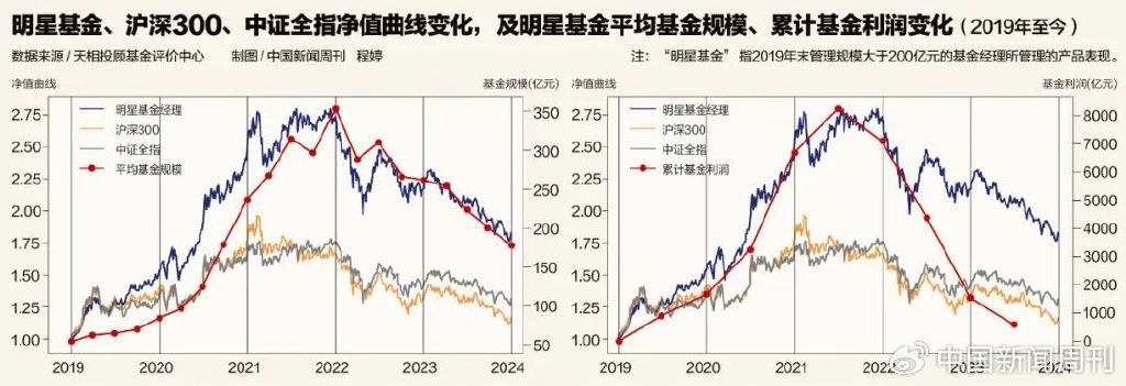 截至2023年年底,市场共有117位百亿级基金经理,仅剩张坤、葛兰、刘彦春3位超500亿规模的基金经理,分别在管约655亿、573亿和539亿元,较千亿时期缩水近半。天相投顾基金评价中心数据显示,明星基金累计利润水平下滑程度严重高于其业绩下滑程度,“近几年,尽管明星基金经理业绩表现大起大落,平均业绩并不算很差,给投资者带来的利润却已所剩无几。基金赚了收益率,基民却没能赚到钱”。