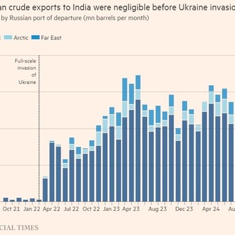 数据显示,印度一直是俄罗斯原油的主要买家,两国贸易总额在2023至2024 财年达到660亿美元的历史新高,比冲突前的一年(2021年)增长了足足五倍之多。